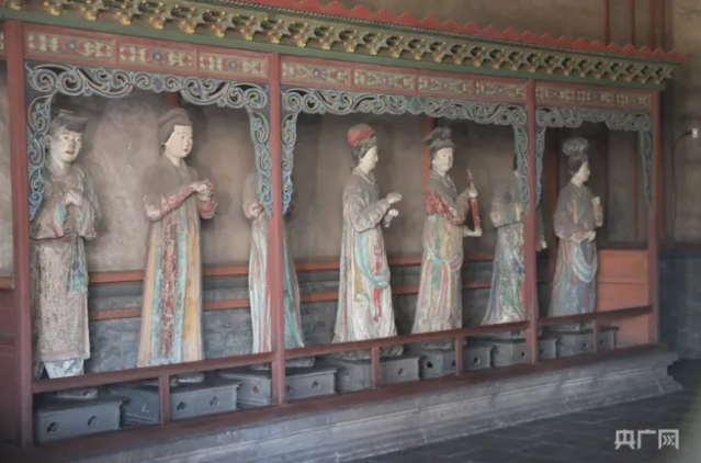 俯瞰晉祠公園(央廣網(wǎng)記者 郎麒 攝) 晉祠文化遺存極為豐厚,現(xiàn)存有宋、元、明、清時(shí)期的殿堂樓閣、亭臺(tái)橋榭等古建筑98座,彩塑114尊,鐵質(zhì)文物19尊,壁畫907.2平方米,楹聯(lián)匾額219幅,碑碣石刻444通,館藏文物40982件,古樹名木122株,其中千年以上古樹29株。是中國現(xiàn)存規(guī)模最大、跨越時(shí)代最久遠(yuǎn)、保存最為完整的唐宋祠廟式古典園林,被譽(yù)為中國古建筑博物館。 晉祠“三絕” 宋代彩塑的杰出代表——侍女像。宋代彩塑侍女像突破了宋以前宗教造像的模式,成為現(xiàn)實(shí)生活中真實(shí)人物的寫照,是按照封建社會(huì)的宮廷制排列的,是宋代皇室生活的縮影,展現(xiàn)了不同年齡、不同個(gè)性的女性形象,她們個(gè)個(gè)眉目傳神,形態(tài)瀟灑,栩栩如生,開創(chuàng)了雕塑藝術(shù)寫實(shí)作品的先河。它不僅是中國雕塑史上唯一反映宋代宮廷人物的造像,而且是中國雕塑史上藝術(shù)高超的罕見精品,被譽(yù)為是古今中外歷史上最偉大的雕塑藝術(shù)作品之一,在中國雕塑史和美術(shù)史上占有重要地位。