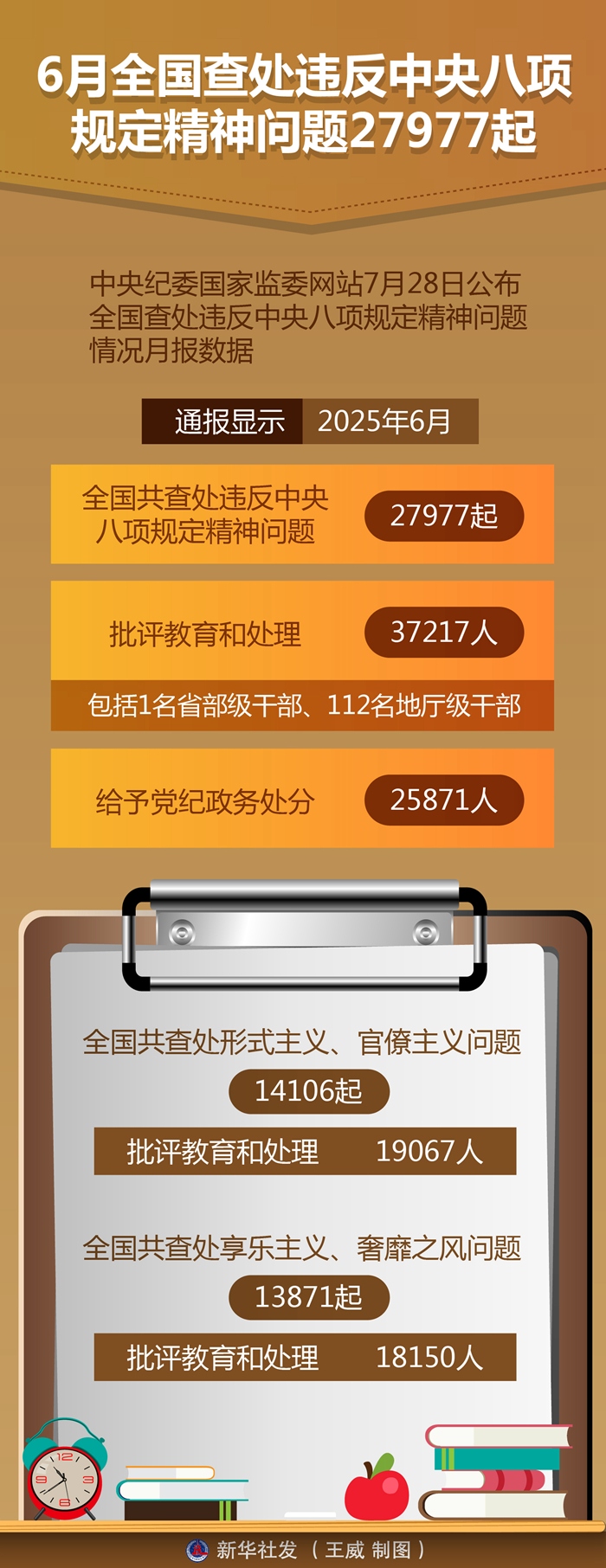 新華社北京7月28日電(記者孫少龍)中央紀(jì)委國家監(jiān)委網(wǎng)站28日公布全國查處違反中央八項(xiàng)規(guī)定精神問題情況月報數(shù)據(jù)。通報顯示,今年6月,全國共查處違反中央八項(xiàng)規(guī)定精神問題27977起,批評教育和處理37217人(包括1名省部級干部、112名地廳級干部),給予黨紀(jì)政務(wù)處分25871人。
