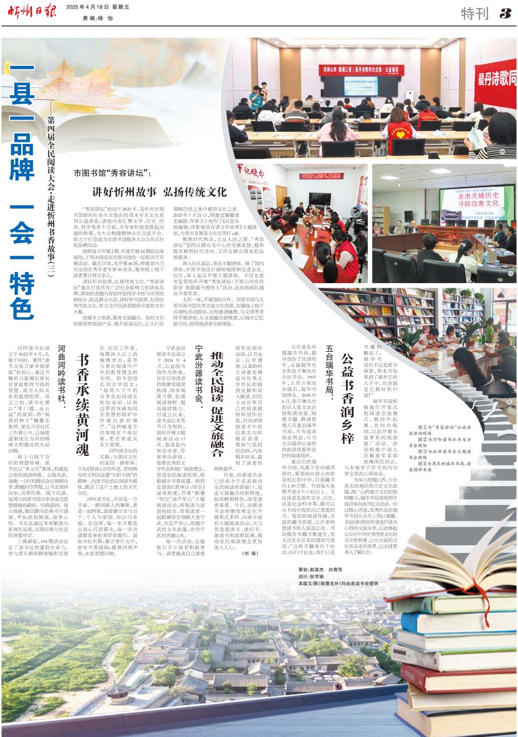 目前,汾源讀書會(huì)已經(jīng)成為寧武縣推動(dòng)全民閱讀的新窗口、促進(jìn)文旅融合的新陣地,獨(dú)具鮮明特色,深受讀者喜愛。今后,汾源讀書會(huì)將繼續(xù)常態(tài)化開展形式多樣、內(nèi)容豐富的主題閱讀活動(dòng),大力營(yíng)造愛讀書、讀好書、善讀書的濃厚氛圍,推動(dòng)全民閱讀理念更加深入人心。(劉強(qiáng))