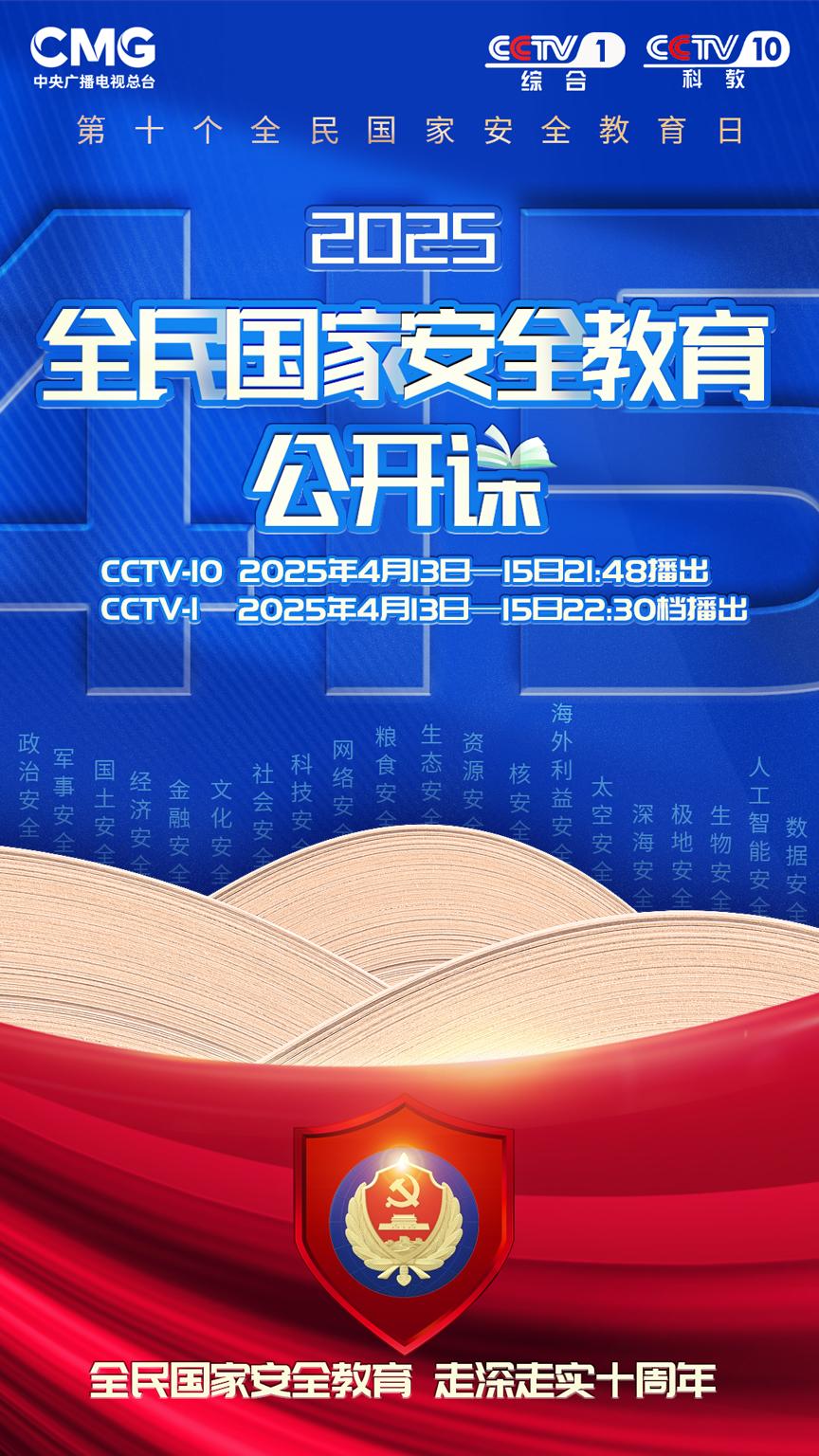 馳而不息,久久為功! 2025年4月15日是第十個全民國家安全教育日 中央廣播電視總臺 攜手國家安全部 重磅推出特別節(jié)目 《2025全民國家安全教育公開課》 今天,我們一起“開講啦”! 生動精彩的講解 將新時代國家安全形勢娓娓道來 驚心動魄的案例 警示著我們危機(jī)暗流涌動 提醒著我們 安而不忘危 存而不忘亡 治而不忘亂 在情景交融的多維空間“教室”中 一個個精彩的國安故事 為您傾情講述 CCTV-10 2025年4月13日—15日21:48 CCTV-1 2025年4月13日—15日22:30檔 《2025全民國家安全教育公開課》 精彩呈現(xiàn) “魔方”般的多維空間 這里有多維空間構(gòu)成的超級課堂 名師的生動講授 知名主持人的以案說法 著名演員的精彩分享 歌手的傾情獻(xiàn)唱 空間變換 交替出場 匯聚成獨具一格的奇妙課堂