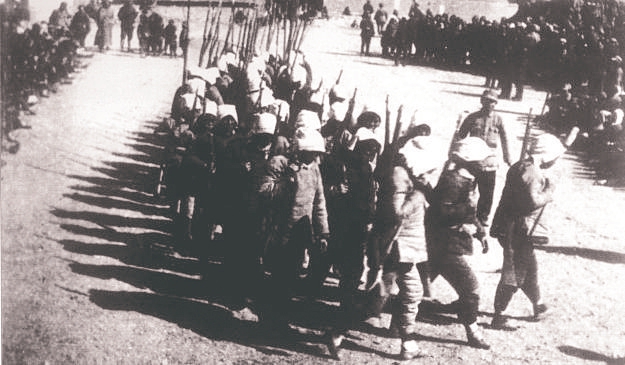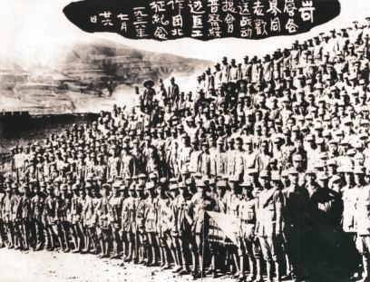圖2 山西新軍既是戰(zhàn)斗隊,又是工作隊。他們走到哪里,宣傳到哪里,動員青年參軍;組織人民武裝自衛(wèi)隊、游擊隊;協(xié)助地方建黨、建政,組建工、農、青、婦等群眾團體,創(chuàng)建抗日根據(jù)地。圖為1938年初,決死隊戰(zhàn)士在沁縣書寫宣傳標語。